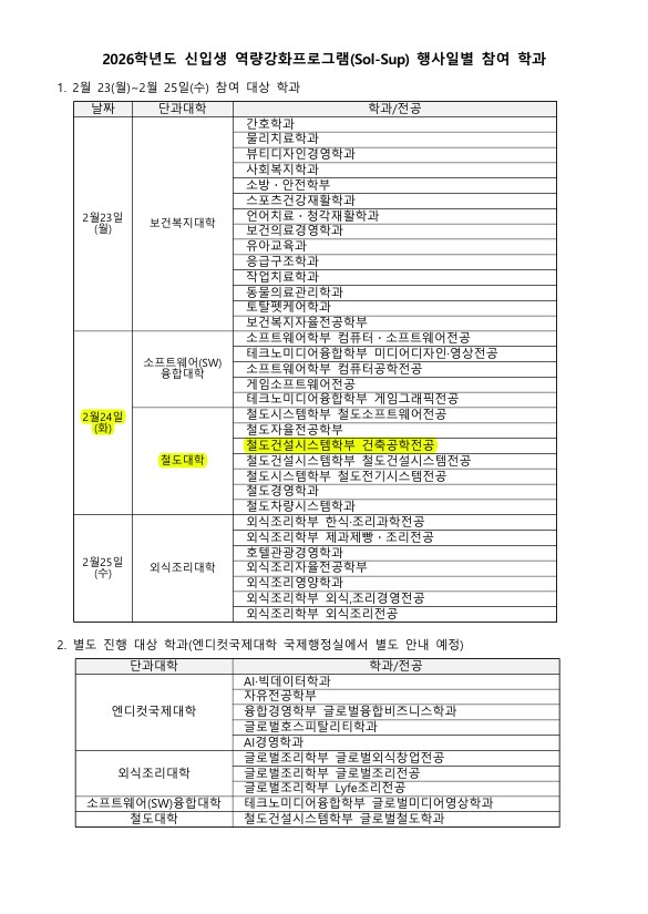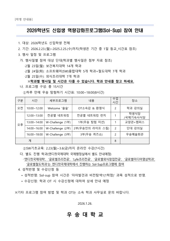 커뮤니티 공지사항 전공뉴스 포토갤러리 재학생 Q&A 공지사항Home커뮤니티공지사항 2026학년도 신입생 역량강화프로그램(Sol-Sup) 참여 안내 작성자 : 학과관리자 | 작성일 : 2026.02.03 | 조회수 : 150 첨부파일 [101]11.jpg [32]22.jpg 목록 이전글 2026학년도 1학기 신· 편입생 수강신청 안내 다음글 우송대학교 2025학년도 전기 학위수여식 안내